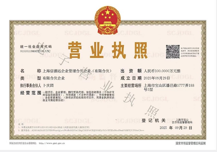 祝贺:上海信德远企业管理合伙企业(有限合伙)成立